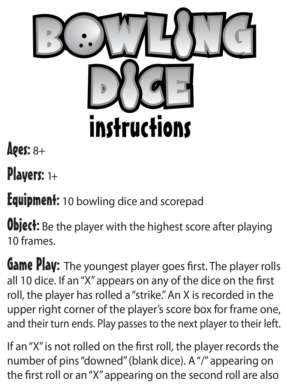 Most of the spaces on the dice are blank or have a picture of a bowling pin but some include an X which represents a strike or a which represents a spare. Youll find FREE online rules and tips for board party card dice tile and word games from Checkers to Scrabble to. Get the free printable instruction sheet and scoring chart here.